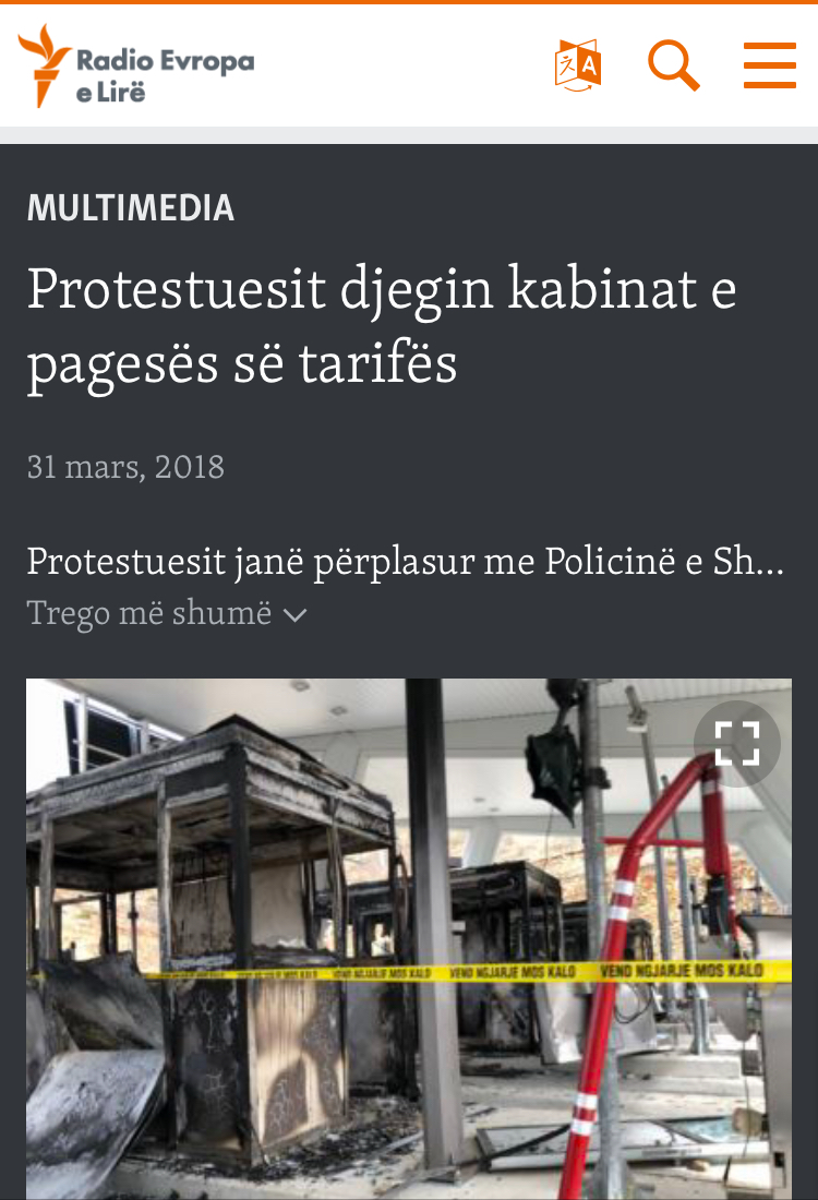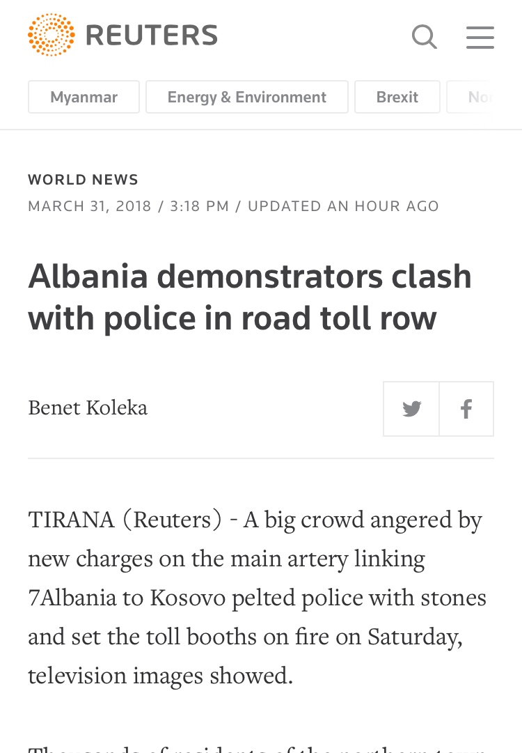 “Protesta të dhunshme në Shqipëri mes policisë dhe qindra qytetarëve që protestonin kundër taksës së re në autostradën që lidh Shqipërinë me Kosovën”.