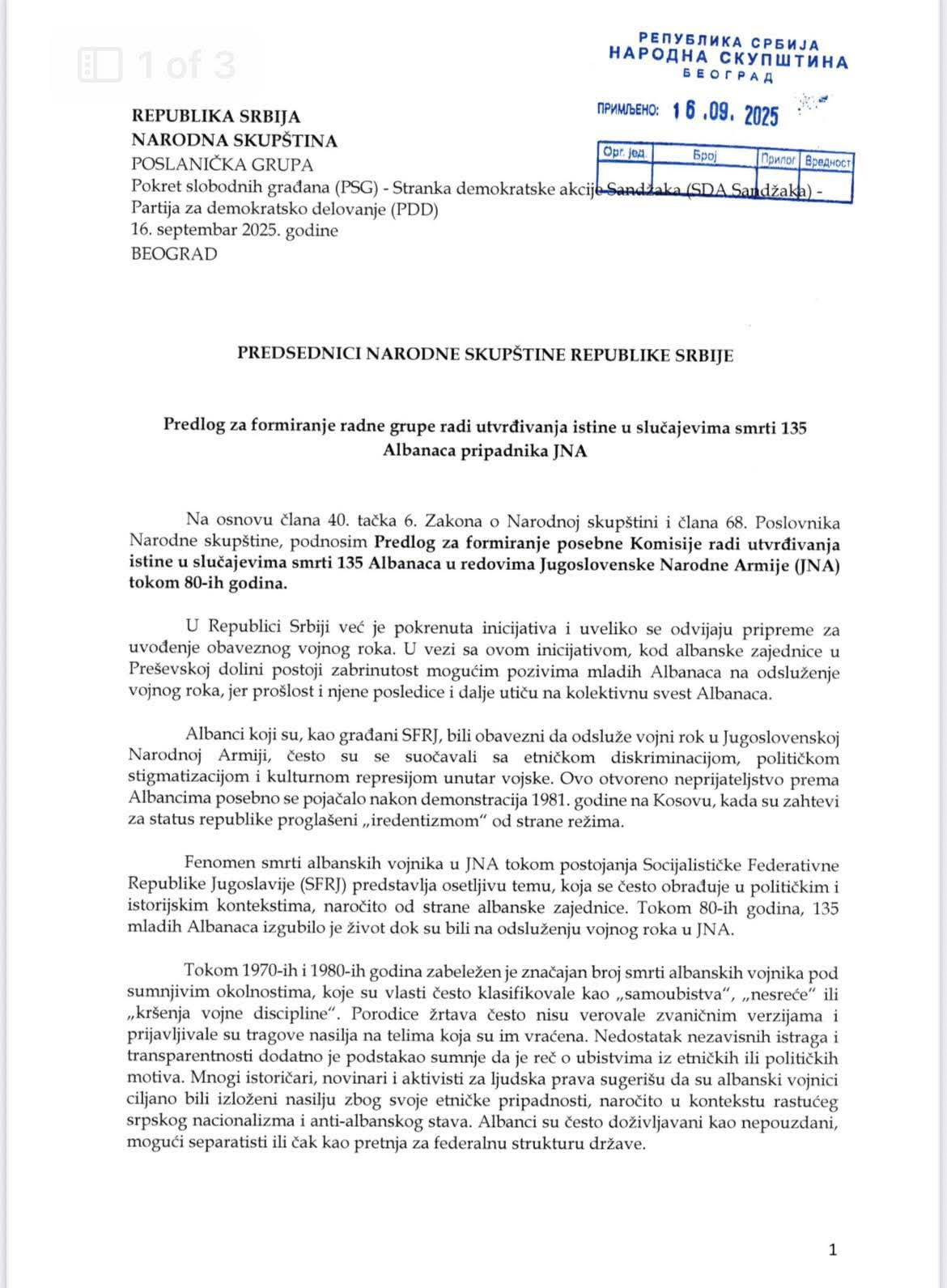 Prandaj, në procedurë parlamentare, sot, dorëzova Propozimin për themelimin e një Komisioni të posaçëm, me mandat për të zbardhur rastet e vdekjeve të 135 ushtarëve shqiptarë në radhët e Armatës Popullore të Jugosllavisë (APJ) gjatë viteve ’80.
