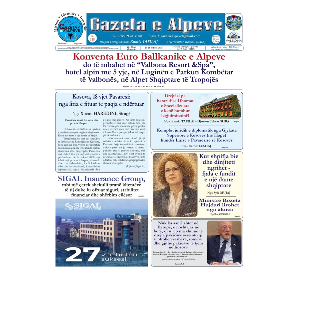 Ballina Aktualitet Faqja e parë e “Gazeta e Alpeve”- Nr. 118, dt. 16-28 shkurt... AktualitetDiasporaED/OPHistoriIntervistëKosovaKryesoreLibraMali i ZiMaqedoniaPersonazhPoeziPortretRajoniRavijëzimeShqipëriSport Faqja e parë e “Gazeta e Alpeve”- Nr. 118, dt. 16-28 shkurt 2026 February 28, 2026 Share Facebook Twitter Google+ Pinterest WhatsApp ARTIKUJ TË NGJASHËMMË SHUMË NGA AUTORI Faqja e parë e “Gazeta e Alpeve” Nr. 115, dt. 5 – 16 janar 2026 Faqja e parë e “Gazeta e Alpeve” Nr. 117 dt. 1-15 shkurt 2026 Sulmet në Lindjen e Mesme, reagime nga ndërkombëtarët Aktualitet Faqja e parë e “Gazeta e Alpeve” Nr. 115, dt. 5... limit - February 28, 2026 0 Faqja e parë e “Gazeta e Alpeve” Nr. 117 dt. 1-15... February 28, 2026 Faqja e parë e “Gazeta e Alpeve”- Nr. 118, dt. 16-28... February 28, 2026 KE propozon heqjen e Roaming-ut për vendet e Ballkanit Perëndimor February 25, 2026 40% e të diplomuarve nuk punësohen në profilin e tyre February 21, 2026 Zvicra mban Referendum/ 10 milionë, jo më shumë… February 12, 2026 Fëmijët përballë ekraneve tashmë një betejë e humbur February 4, 2026 Numri i të huajve që jetojnë në Shqipëri arriti rekord në... February 3, 2026 Shqiptarët besnikë ndaj parasë Cash February 2, 2026 Shkrimi i dorës në rrezik nga teknologjia, UNESCO kërkon mbrojtjen e... February 1, 2026 AMF publikon raportin vjetor 2025: SIGAL IG paguan 26.02% të dëmeve... January 30, 2026 INSTAT: 22% e emigrantëve kthehen në Shqipëri January 29, 2026