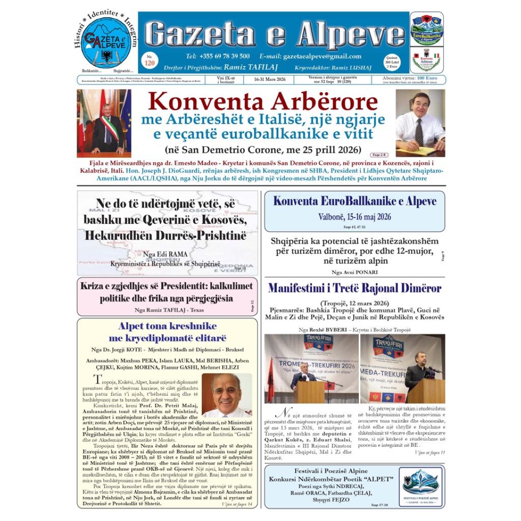 Ballina Aktualitet Faqja e parë e “Gazeta e Alpeve” Nr. 120, dt. 16 –... AktualitetDiasporaED/OPHistoriIntervistëKosovaKryesoreKulturëLibraMali i ZiMaqedoniaPersonazhPoeziPortretRajoniRavijëzimeShqipëri Faqja e parë e “Gazeta e Alpeve” Nr. 120, dt. 16 – 31 Mars 2026 March 24, 2026 Share Facebook Twitter Google+ Pinterest WhatsApp ARTIKUJ TË NGJASHËMMË SHUMË NGA AUTORI Bursat bien dhe nafta rritet mes përshkallëzimit të kërcënimeve mes Trump dhe Iranit A do të ishim të njëjtë nëse do të kishim lindur diku tjetër? Çfarë ndodh me mesazhet e tua në Instagram pas 8 majit? Aktualitet Faqja e parë e “Gazeta e Alpeve” Nr. 120, dt. 16... limit - March 24, 2026 0 Faqja e parë e “Gazeta e Alpeve” Nr. 119, dt.... March 12, 2026 Dita e Verës në Tiranë, devijohet trafiku për 2 ditë! Si... March 12, 2026 Portofoli i risiguruesve të SIGAL: garanci dhe ekspertizë ndërkombëtare March 9, 2026 Sa po i kushton Shqipërisë lufta në Lindjen e Mesme? March 8, 2026 Lufta, tregjet financiare në presion March 4, 2026 MEPJ njoftim për shqiptarët që janë rezidentë apo vizitorë në Iran March 4, 2026 Faqja e parë e “Gazeta e Alpeve” Nr. 115, dt. 5... February 28, 2026 Faqja e parë e “Gazeta e Alpeve” Nr. 117 dt. 1-15... February 28, 2026 Faqja e parë e “Gazeta e Alpeve”- Nr. 118, dt. 16-28... February 28, 2026 KE propozon heqjen e Roaming-ut për vendet e Ballkanit Perëndimor February 25, 2026 40% e të diplomuarve nuk punësohen në profilin e tyre February 21, 2026