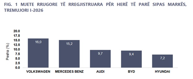 Në mjetet e regjistruara për herë të parë, Volkswagen mban vendin e parë me 16,0%, e ndjekur nga Mercedes Benz me 15,2%.
